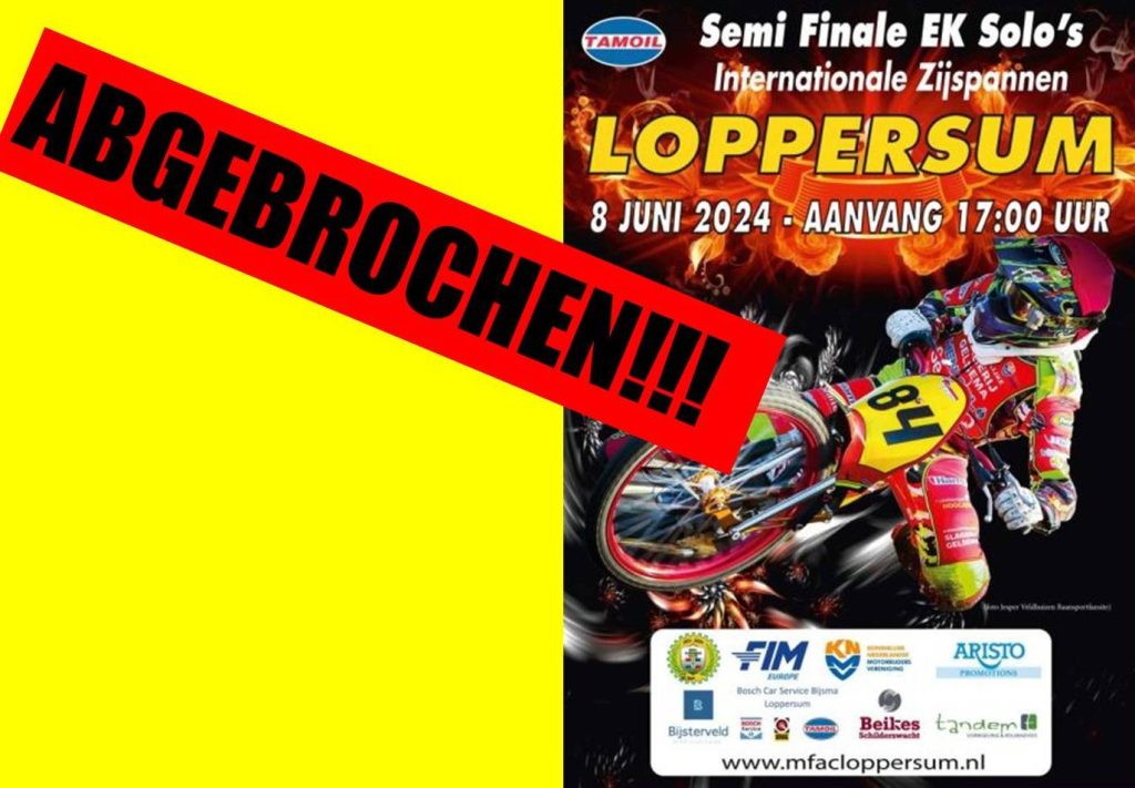 Der weite Weg …war umsonst (!): Julian Bielmeier hätte gestern beim Grasbahn-EM-Semifinale in Loppersum (Niederlande) starten dürfen. „Hätte“ …weil es auch an der Nordseeküste heftig geregnet hat. Zunächst wurde der Start verschoben, dann wurde die Veranstaltung nach zwei Läufen abgebrochen!