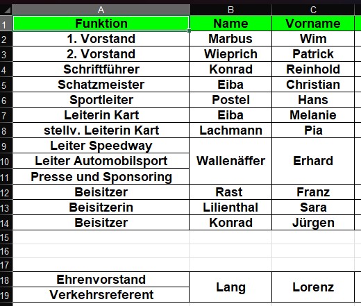 Von links: Jürgen Konrad (Beisitzer), Reinhold Konrad (Schriftführer), Wim Marbus (1. Vorstand), Patrick Wieprich (2. Vorstand), Hans Postel (Sportleiter), Christian Eiba (Schatzmeister), Franz Rast (Beisitzer) / sitzend: Pia Lachmann (stellv. Leiterin-Kartslalom), Melanie Eiba (Leiterin-Kartslalom / auf dem Bild fehlt: Erhard Wallenäffer (Leiter-Speedway und Automobilsport sowie Pressearbeit + Sponsoring)